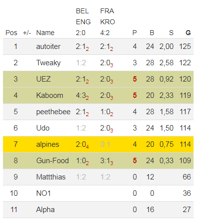 Danach folgen General Kaboom (119 welcher einen beachtlichen Start hatte), peethebee (117), Udo (114), ich (114) und admin mit 109 Punkten.