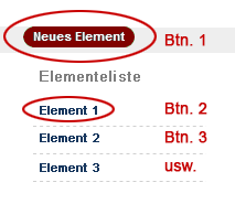 Mittels Mouseover oder auch Klick auf "Neues Element" (Btn. 1) -> es klappt dann einen Liste zur Auswahl aus und man klickt bspw. auf "Element 1" (Btn. 2) -> und abschließend noch auf "Speichern", um den Vorgang abzuschließen. Danach wird das nächste Element angelegt usw. Die Maske sieht beispielhaft so aus: