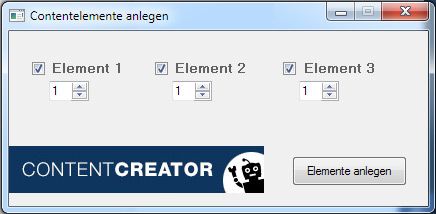 - In einer kleinen GUI mit Checkboxen und UpDown bzw. Inputfeld für jedes Element kann ausgewählt werden, a) ob überhaupt Elemente angelegt werden sollen und b) wenn ja, wieviele davon
