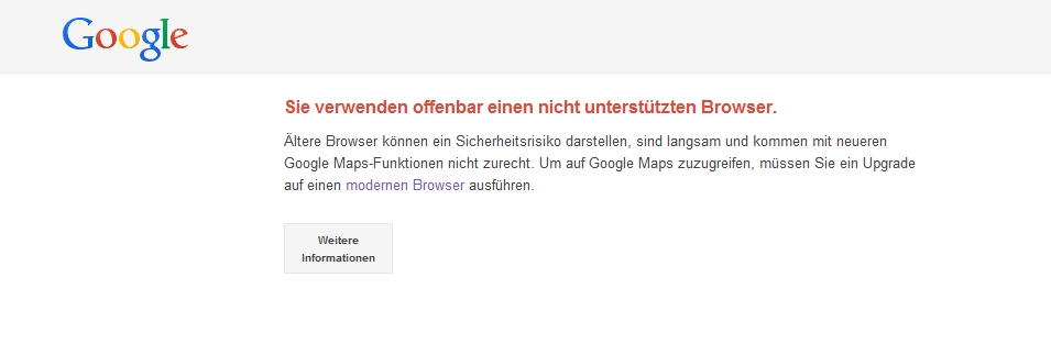 Obwohl auf der Workstation der aktuelle IE läuft, meldet Google Maps zurück das mein Browser nicht unterstützt wird (zu alt).