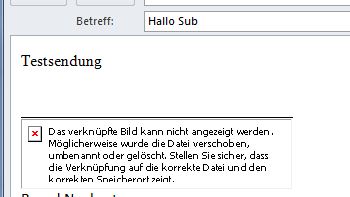 Dann erscheint zwar der Text, jedoch das eigebettete Bild (Firmenlogo) wird nicht angezeigt. Es wird mit einem roten Kreuz quittiert.