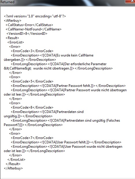Global $sAdditionalData = "<AfterbuyGlobal><PartnerID>" & "1111111" & "</PartnerID><PartnerPassword>" & "aJwy6vmamAVEddhq=SYkkGMf" & "</PartnerPassword><UserID>" & "102244_abcdef" & "</UserID><UserPassword>" & "NJby6vjknguviZTCEdZhq=SYkkGMf" & "</UserPassword><CallName>" & "GetSoldItems" & "</CallName><DetailLevel>" & "0" & "</DetailLevel><ErrorLanguage>DE</ErrorLanguage></AfterbuyGlobal>"