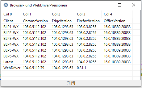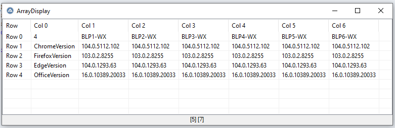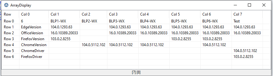 Code_ArrayDisplay($aErgebnis, "Browser- und WebDriver-Versionen", "1:", $ARRAYDISPLAY_NOROW + $ARRAYDISPLAY_COLALIGNCENTER, Default, _ArrayToString($aErgebnis, "|", 0, 0))Super, perfekte Unterstützung hier! AutoIt hat so viele Feinheiten, dass man manchmal den Wald vor lauter Bäumen nicht sieht. Hatte diese Titel-Funktion bei _ArrayDisplay() noch nie benutzt.
