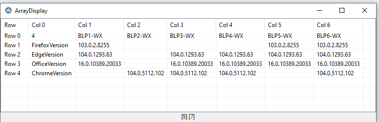 Alles anzeigen#include <Array.au3> Global $sIniDatei = @ScriptFullPath Global $aErgebnis = Ini2Array($sIniDatei, True, True) ; sort sections and keys $aErgebnis[0][0] = "Client" Local $aRowLatest = _ArrayFindAll($aErgebnis, "Latest") ; row for latest version For $i = 1 To UBound($aErgebnis, $UBOUND_COLUMNS) - 1 $aErgebnis[$aRowLatest[0]][$i] = _ArrayMax($aErgebnis, 0, 1, $aRowLatest[0], $i) Next _ArrayDisplay($aErgebnis, "Browser- und WebDriver-Versionen", "", $ARRAYDISPLAY_NOROW) Func Ini2Array($sIni, $bSortSections, $bSortKeys) Local $aKeys = IniGetAllKeys($sIni) If $bSortKeys Then _ArraySort($aKeys) Local $aSectionNames = IniReadSectionNames($sIni) If $bSortSections Then _ArraySort($aSectionNames) If @error Then Return SetError(@error, 0, 0) Local $aResult[UBound($aSectionNames)][UBound($aKeys)] Local $iMax = UBound($aKeys) - 1 For $I = 0 To $iMax $aResult[0][$I] = $aKeys[$I] Next Local $sSection For $I = 1 To $aSectionNames[0] $sSection = $aSectionNames[$I] $aResult[$I][0] = $sSection For $J = 1 To $iMax $aResult[$I][$J] = IniRead($sIni, $sSection, $aKeys[$J], "---") Next Next Return $aResult Endfunc Func IniGetAllKeys($sIni) Local $aKeys[0] Local $sData = "|" Local $aSections = IniReadSectionNames($sIni) For $i = 1 To $aSections[0] Local $aInhalt = IniReadSection($sIni, $aSections[$i]) If @error = 0 Then For $j = 1 To $aInhalt[0][0] If Not StringInStr($sData, "|" & $aInhalt[$j][0] & "|") Then $sData &= $aInhalt[$j][0] & "|" Next EndIf Next If StringRight($sData, 1) = "|" Then $sData = StringTrimRight($sData, 1) _ArrayAdd($aKeys, $sData) Return $aKeys EndFunc #Region eingebettete INI #cs [Latest] [BLP1-WX] EdgeVersion=105.0.1293.63 FirefoxVersion=103.0.3.8255 ChromeVersion=105.0.5112.102 OfficeVersion=16.0.10389.20033 [BLP3-WX] ChromeVersion=104.0.5112.102 EdgeVersion=104.0.1293.63 FirefoxVersion=103.0.2.8255 OfficeVersion=16.0.10389.20033 [BLP2-WX] EdgeVersion=104.0.1293.63 ChromeVersion=104.0.5112.102 FirefoxVersion=103.0.2.8255 OfficeVersion=16.0.10389.20033 [BLP4-WX] ChromeVersion=104.0.5112.102 EdgeVersion=105.0.1293.63 FirefoxVersion=104.0.2.8255 OfficeVersion=16.0.10389.20033 [BLP5-WX] ChromeVersion=104.0.5112.102 EdgeVersion=104.0.1293.63 FirefoxVersion=103.0.2.8255 OfficeVersion=16.0.10389.20033 [BLP6-WX] ChromeVersion=104.0.5112.102 EdgeVersion=104.0.1293.63 FirefoxVersion=103.0.2.8255 OfficeVersion=16.0.10389.20033 [WebDriver] ChromeVersion=104.0.5112.79 EdgeVersion=104.0.1293.63 FirefoxVersion=0.31.1 #ce #EndRegion eingebettete INI -