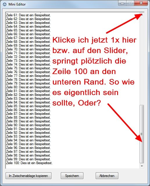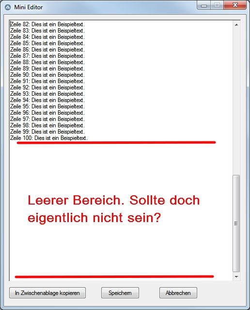 Als Beispiel hab ich ein kleines Programm das dies (mit Buttons) macht, jedoch mein Problem ist, das dieses Fenster (und auch Desktop) irgendwann zu klein wird. Ich möchte deshalb nicht die Fenstergröße ändern, sondern das am rechten Rand die vertikale Scrollbar 'erscheint' sobald die Objekte nicht mehr in das Fenster passen.