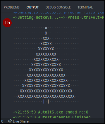 Alles anzeigen_DrawTree(15) Func _DrawTree($iRows) Local $iCountOfSpaces = $iRows - 1 Local Const $sMaxPadding = _CharacterRepeat(' ', $iCountOfSpaces) Local Const $sPeakCharacter = '*' Local Const $sTreeCharacter = 'X' Local Const $sTribeCharacter = '| |' Local $iCountOfTreeCharacters = 1 _Print() ; only for design purposes For $i = 1 To $iRows Step 1 Switch $i Case 1 _Print($sMaxPadding & $sPeakCharacter & $sMaxPadding) Case 2 _Print($sMaxPadding & $sTreeCharacter & $sMaxPadding) Case $iRows Local $sPadding = StringTrimRight($sMaxPadding, 1) _Print($sPadding & $sTribeCharacter & $sPadding) Case Else $iCountOfSpaces -= 1 $iCountOfTreeCharacters += 2 Local $sPadding = _CharacterRepeat(' ', $iCountOfSpaces) Local $sTreeCharacters = _CharacterRepeat($sTreeCharacter, $iCountOfTreeCharacters) _Print($sPadding & $sTreeCharacters & $sPadding) EndSwitch Next _Print() ; only for design purposes EndFunc Func _CharacterRepeat($sCharacter, $iOccurrence = 1) ; I know about _StringRepeat(), but I don't ; want to include a UDF only for one function of it Local $sCharacters = Null For $i = 1 To $iOccurrence Step 1 $sCharacters &= $sCharacter Next Return $sCharacters EndFunc Func _Print($sText = '') ConsoleWrite($sText & @CRLF) EndFunc