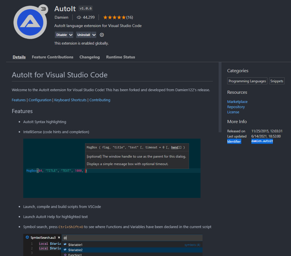 Falls du deine AutoIt Projekte ebenfalls mit VSCode umsetzt, dann könnte dich meine AutoIt Snippets Extension dazu interessieren oder dir sogar helfen deine Projekte schneller umzusetzen.- Mich würde es sehr freuen wenn ihr einen Blick über das Projekt werfen könntet.