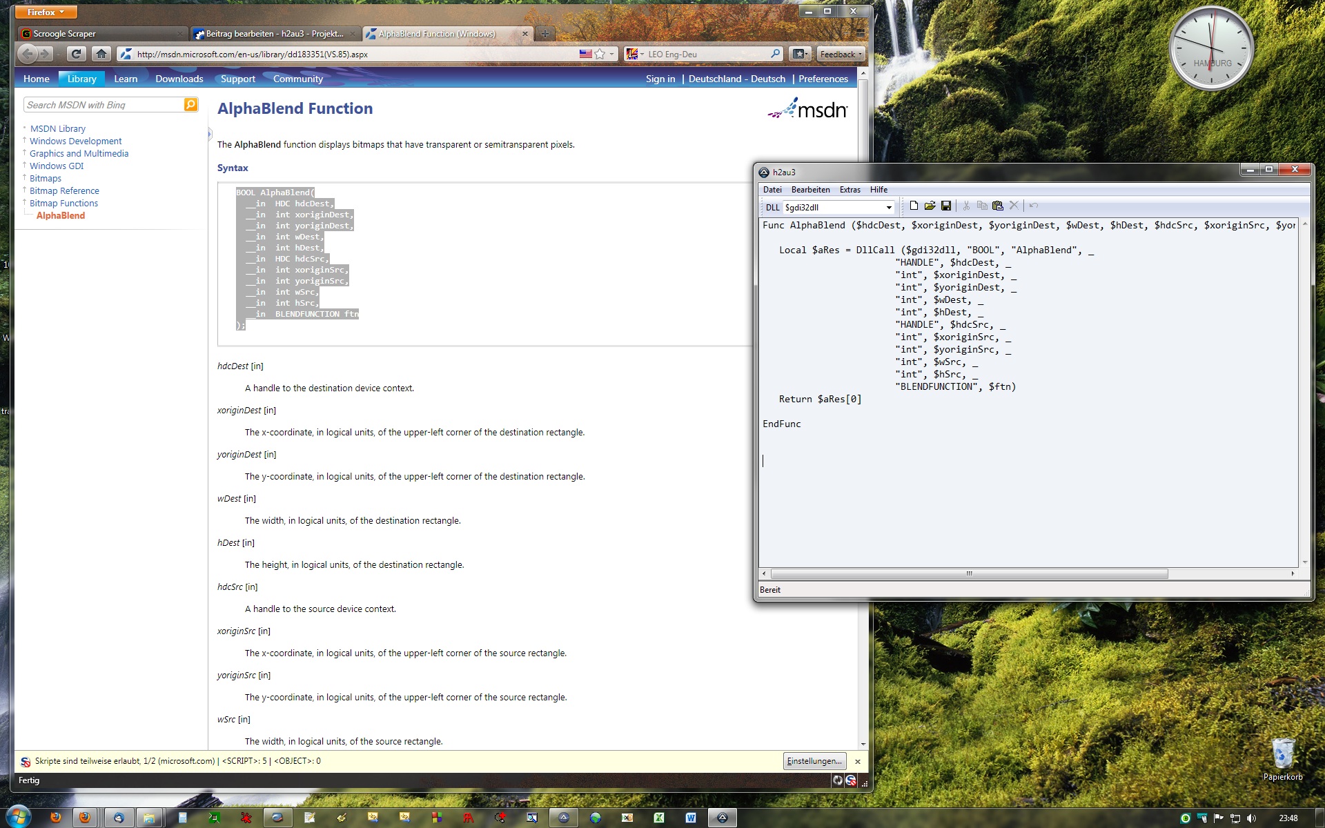 h2au3 starten, eine Funktion/Struktur aus der MSDN oder einer C Headerdatei kopieren, z.B. AlphaBlend. Die Funktionssyntax in die Zwischenablage kopieren, auswählen was konvertiert werden soll - in diesem Falle eine Funktion oder einfach "Alles" auswählen - und "F5" drücken. Fertig.