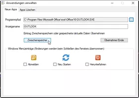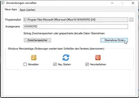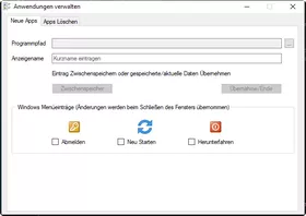 Als Alias wird automatisch der Programmname verwendet, ist aber frei editierbar. Die System-Events: Abmelden / Neustart / Herunterfahren können per Checkbox in das Menü übernommen werden.